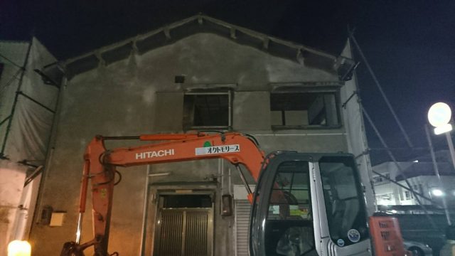 重機を使い壁、屋根、梁、柱などが残った上屋を解体し、基礎を掘り起こし撤去していきます。